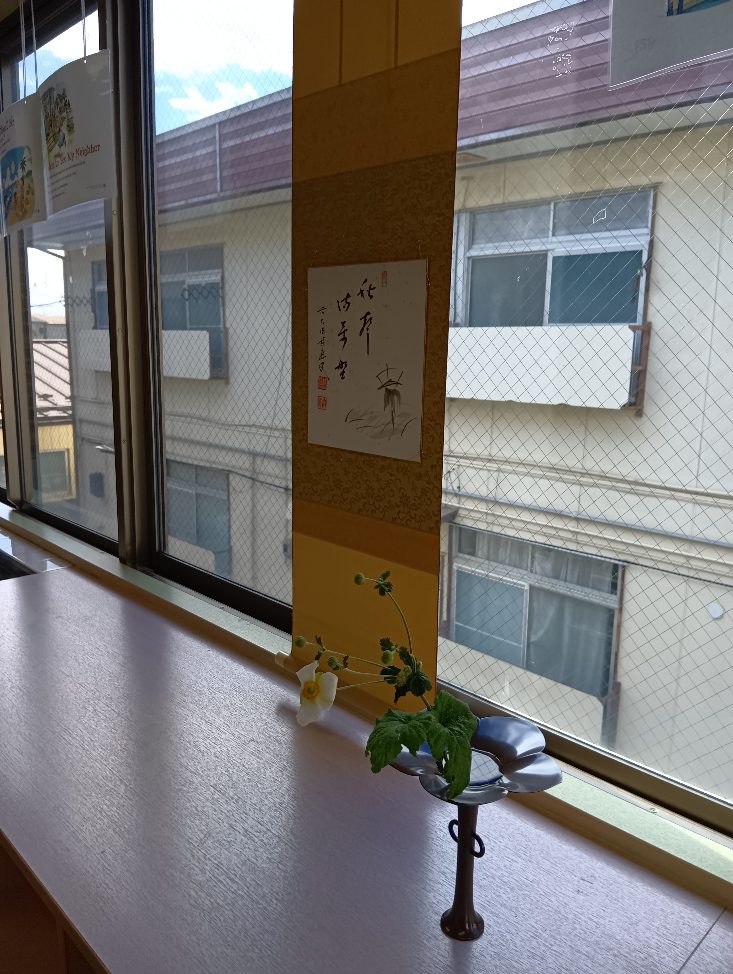 本日は座り方や立ち方、礼の仕方を確認し、掛け軸や茶花のお話を聞きました。