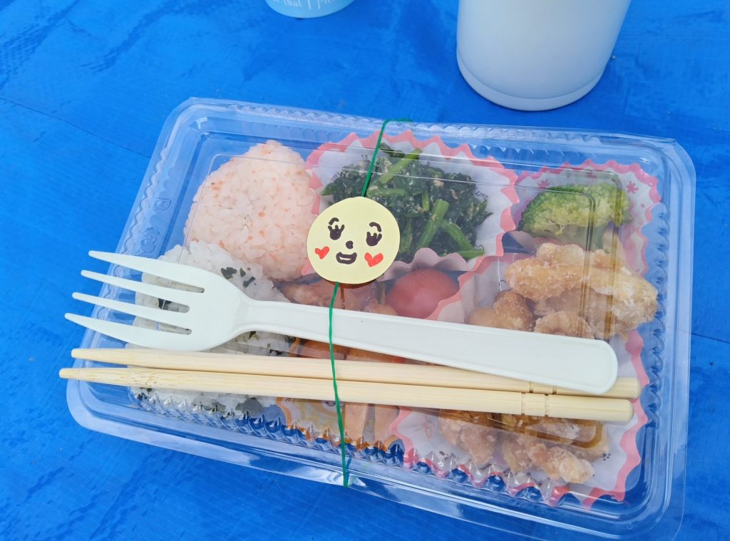 メニューは、「梅と鮭のおにぎり、わかめおにぎり、からあげ、たこさんウインナー、ほうれん草のごま和え、ブロッコリー、ミニトマト」です。