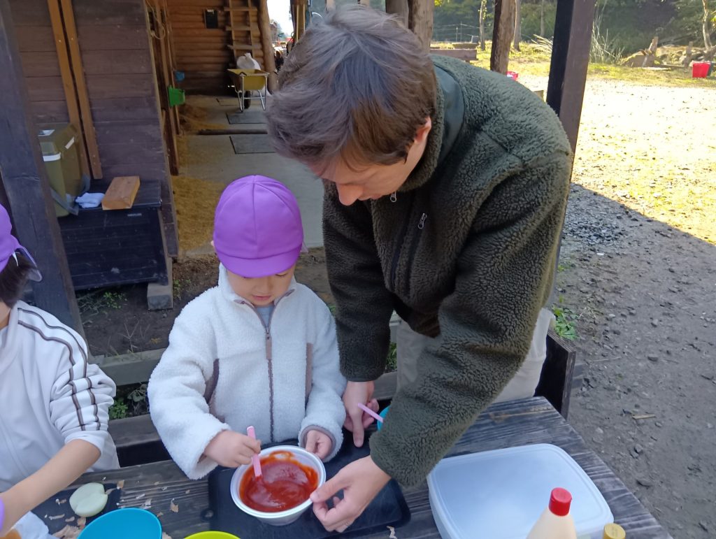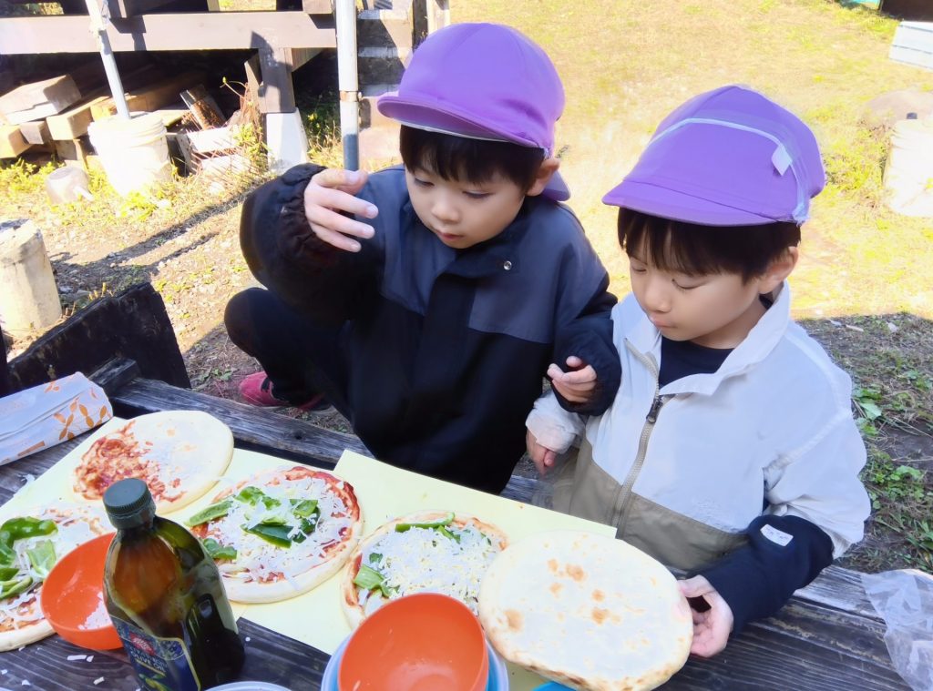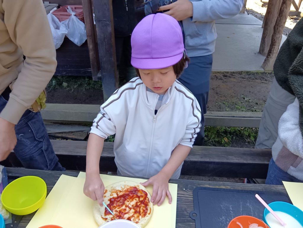「たまねぎはこのくらい!」「ピーマンは少しでいいかな?」「チーズいっぱい!!」と、自分好みのピザを作ろうと工夫する姿が見られておりました♪