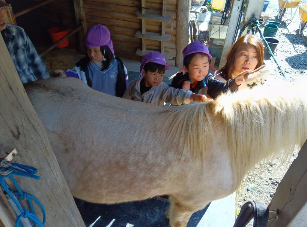 昼食後は、馬のブラッシングヤギとの触れ合い等を行いました。