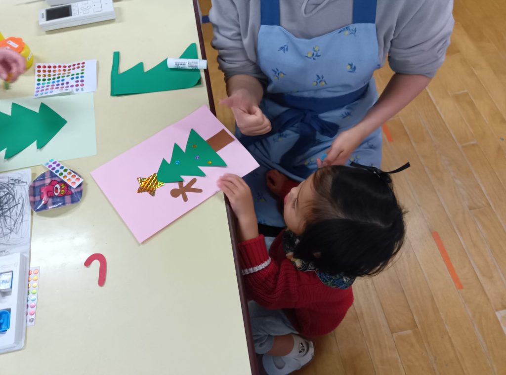 ツリーの形に画用紙を切り、シールやクレヨンでデコレーション★