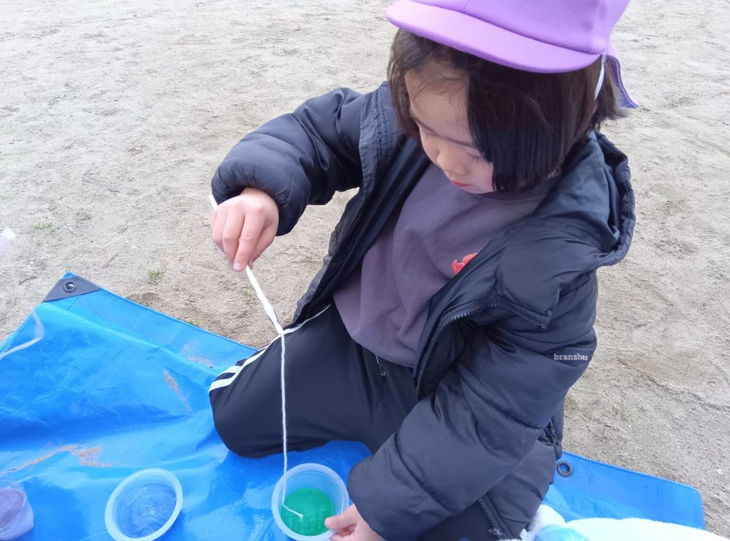午後には、昨日作った色水を凍らせた氷で遊びました。