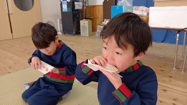 もちもちのお餅と餡の中に甘く煮た牛蒡が挟まれており、「これはなに?」「棒かな?」と不思議そうにしていた子ども達でしたが、ぱくぱくと美味しそうに食べておりました!