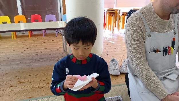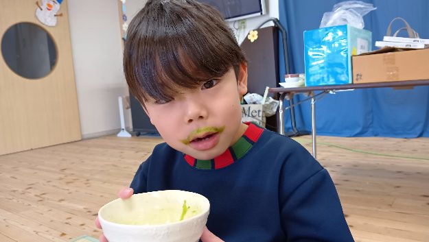 棗の中に入っている抹茶を茶杓ですくい、お茶碗に入れ、棗をもとの場所に戻す、という作業がとても難しいようで苦戦している子もおりましたが、最後まであきらめず取り組んでおりました!