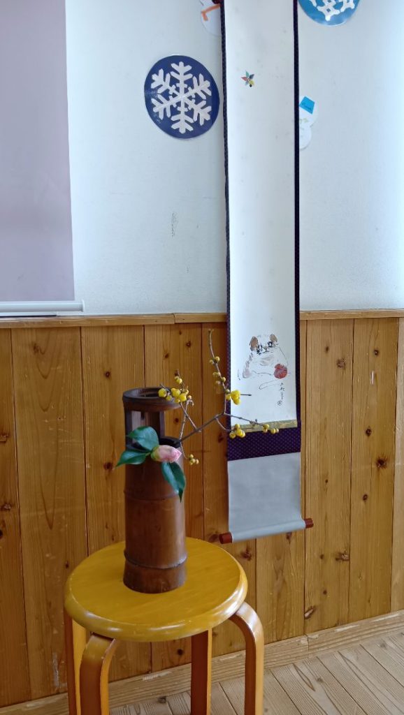本日の掛け軸には犬が毬で遊びながら羽根つきを眺めている絵が描かれておりました。