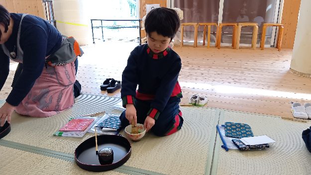 点てたお茶は向かい側に座っているお友達や先生にお出ししました!